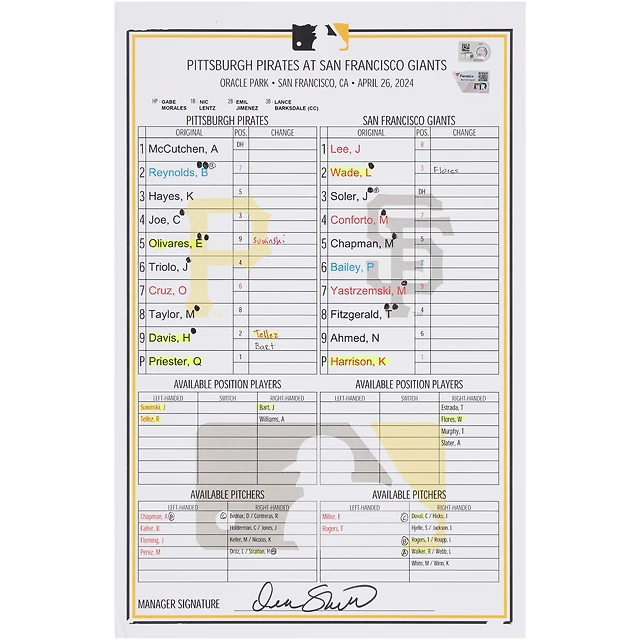 Pittsburgh Pirates Game-Used Lineup Card vs. San Francisco Giants on April 26, 2024