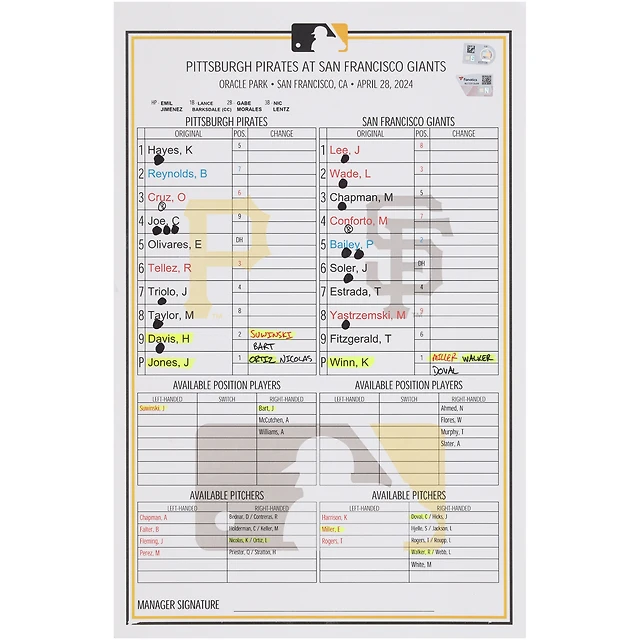 Pittsburgh Pirates Game-Used Lineup Card vs. San Francisco Giants on April 28, 2024