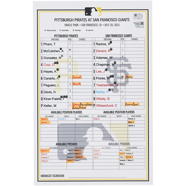 Pittsburgh Pirates Game-Used Lineup Card vs. San Francisco Giants on July 28, 2025