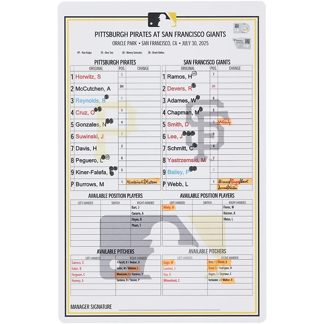 Pittsburgh Pirates Game-Used Lineup Card vs. San Francisco Giants on July 30, 2025