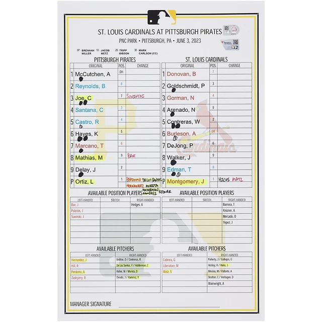 Pittsburgh Pirates Game-Used Lineup Card vs. St. Louis Cardinals on June 3, 2023