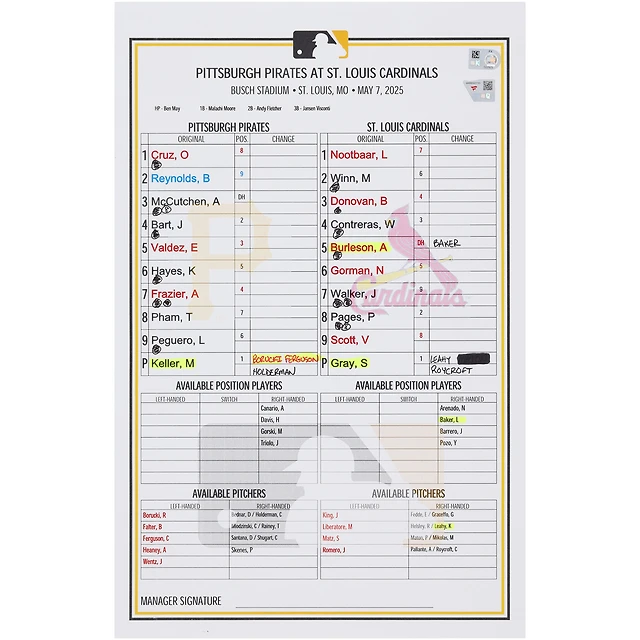 Pittsburgh Pirates Game-Used Lineup Card vs. St. Louis Cardinals on May 7, 2025