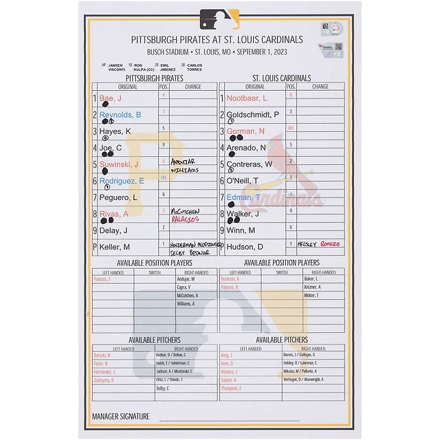 Pittsburgh Pirates Game-Used Lineup Card vs. St. Louis Cardinals on September 1, 2023