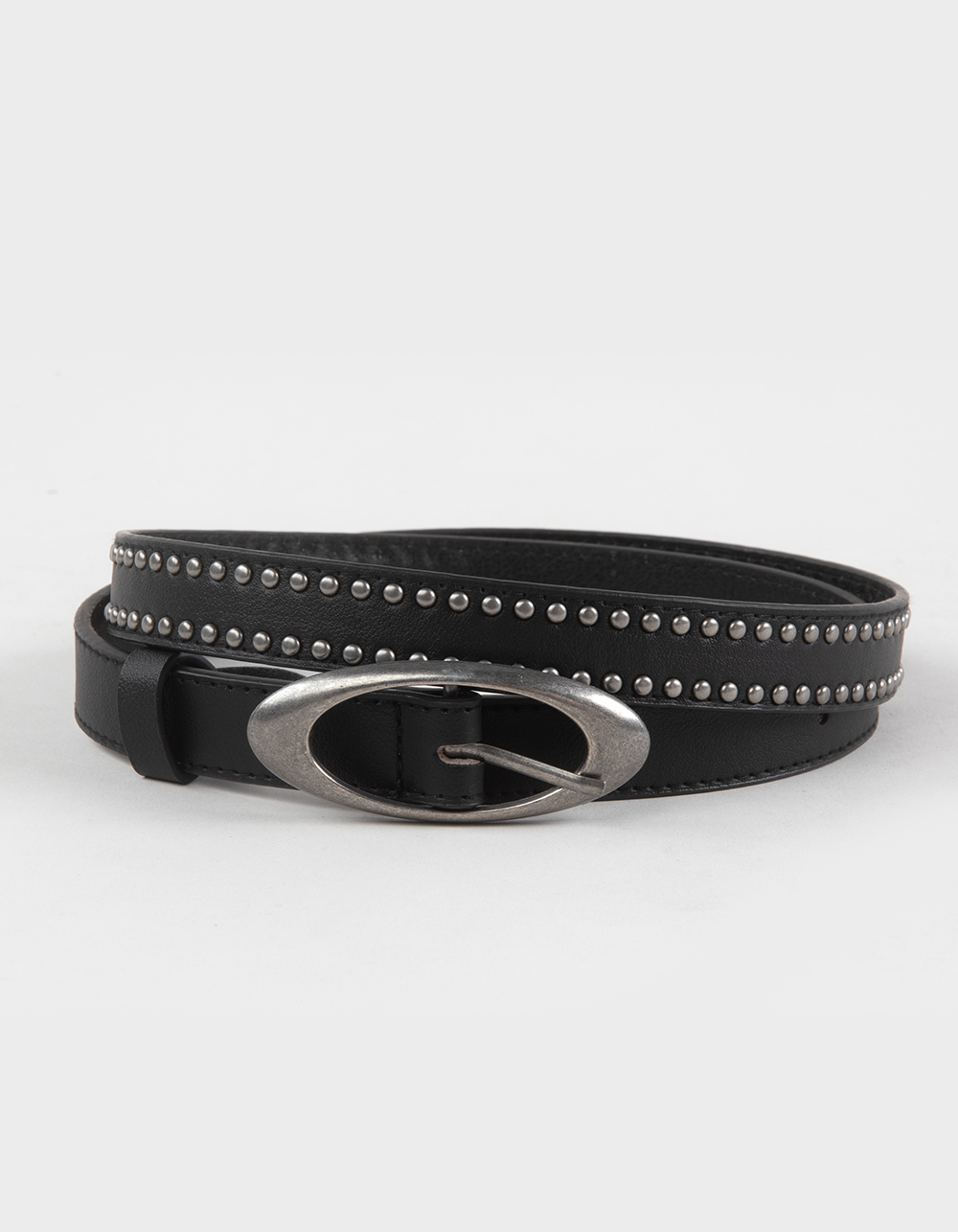 Pixie Nickel Embellished Belt. This sleek black belt features repeating metal stud details and an oval-shaped buckle. Approximate max length: 35" (size S). Imported.