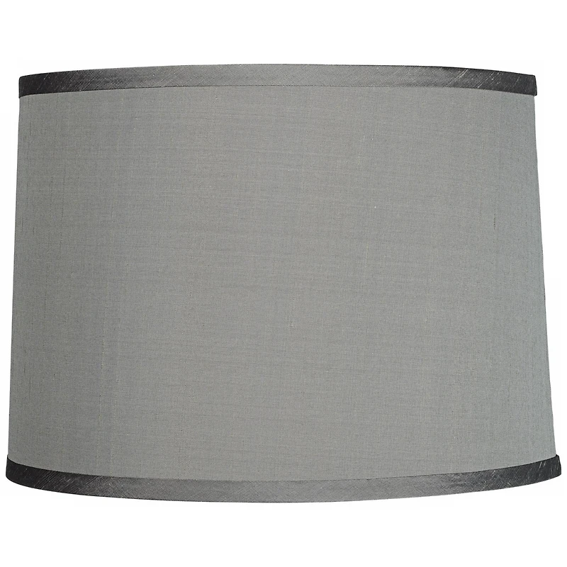A sophisticated and urbane tapered drum shade featuring a cool platinum gray faux silk material. A darker ribbon material is used for the trim top and bottom. Use the shade to refresh an existing favorite lamp.