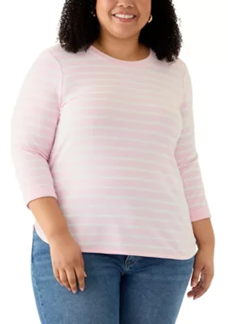 This Crown & Ivy™ shirt features baby terry fabric with a touch of stretch for all-day comfort and wear. The printed design and 3/4 sleeves add dimension and elegance, making it easy to dress up or down for any occasion. Pullover Crew neck 3/4 sleeves Unlined Imported Belk Exclusive Product Specifications 26.5" L Material & Care Polyester, rayon, spandex Machine washable