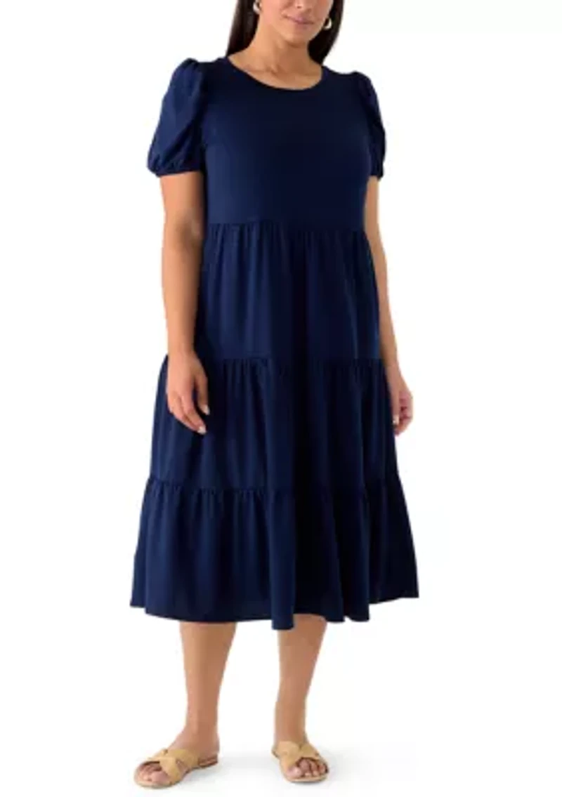 A tiered silhouette and lovely puffed sleeves add to the charming appeal of this baby terry midi dress from Crown & Ivy™. Pullover Collar Short puff sleeves Unlined Imported Belk Exclusive Product Specifications 47" L Material & Care Cotton, polyester, spandex blend Machine washable