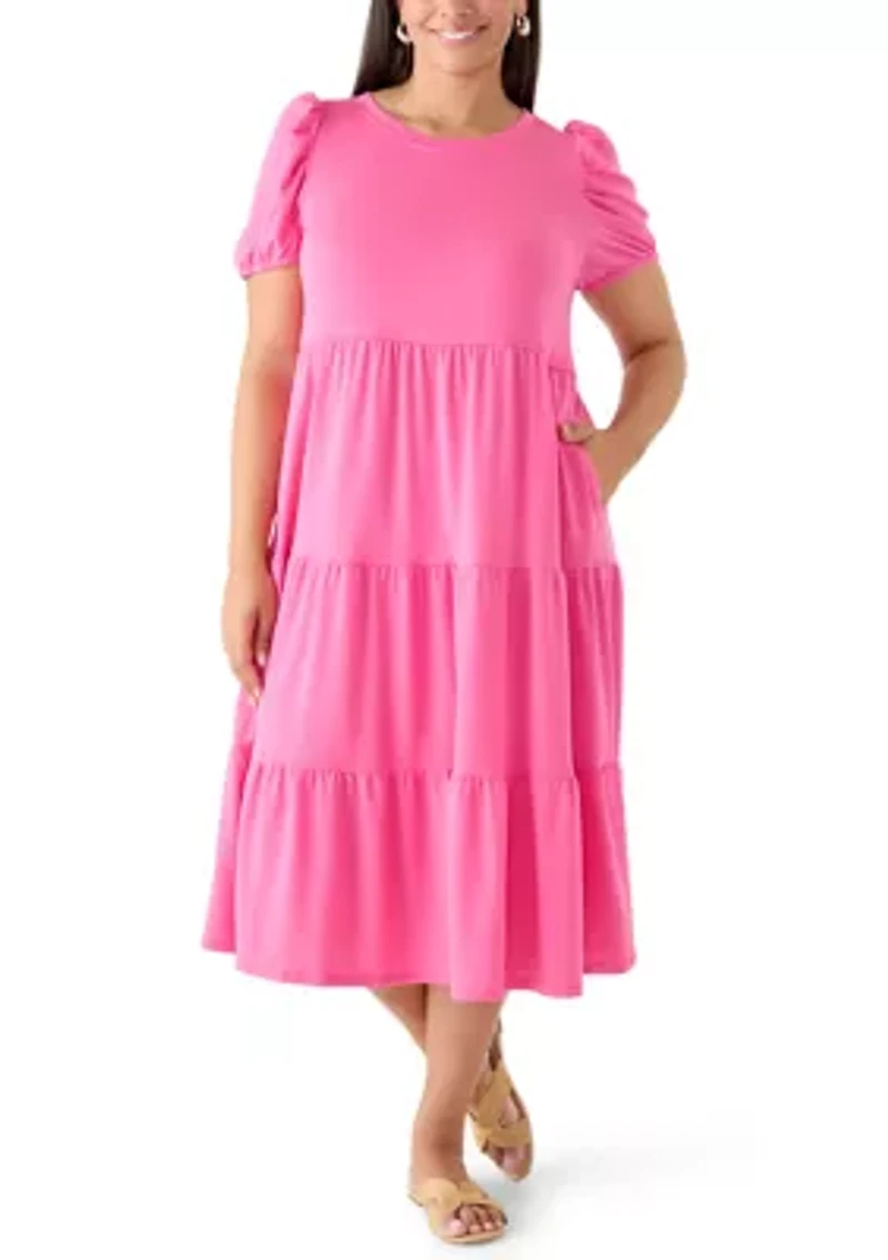 A tiered silhouette and lovely puffed sleeves add to the charming appeal of this baby terry midi dress from Crown & Ivy™. Pullover Collar Short puff sleeves Unlined Imported Belk Exclusive Product Specifications 47" L Material & Care Cotton, polyester, spandex blend Machine washable