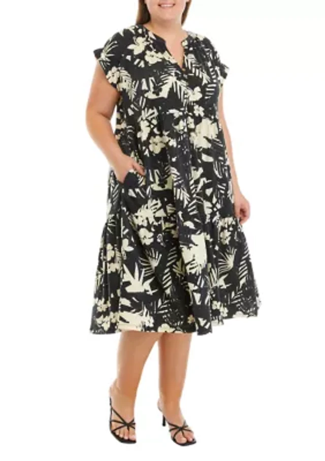 Plus Short Sleeve V-Neck Floral Print Button Front Midi Dress