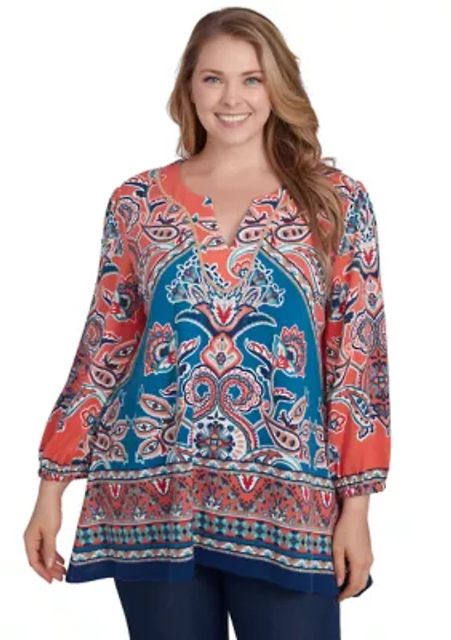 Plus 3/4 Sleeve Knit Split Neck Placement Print Tunic Top