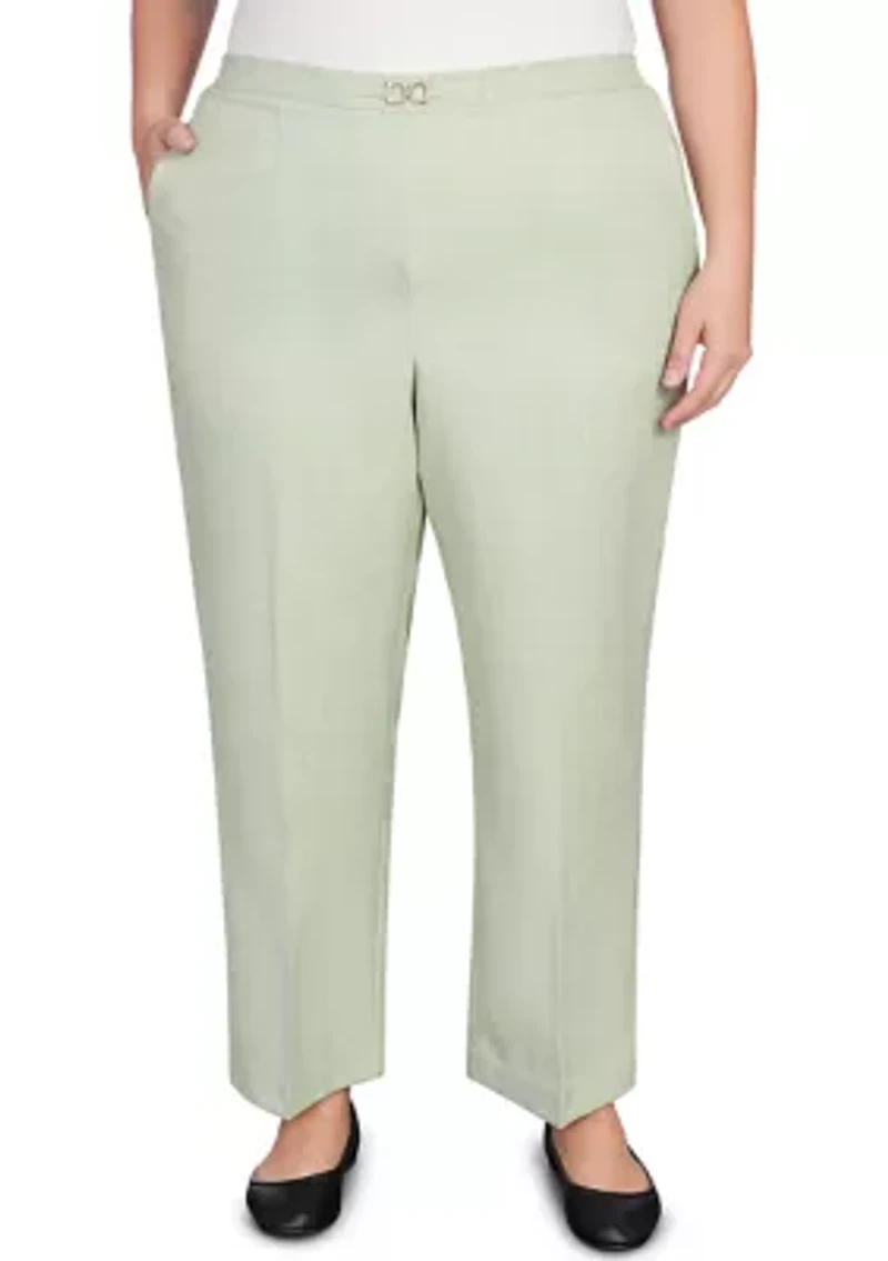 Look fresh in these pull-on buckled pants from Alfred Dunner featuring a hardware accented flat front waistband and side seam pockets. Elastic waistband 2 on-seam pockets Unlined Regular fit Imported Product Specifications Short length 27.5" Inseam Material & Care Polyester Machine washable