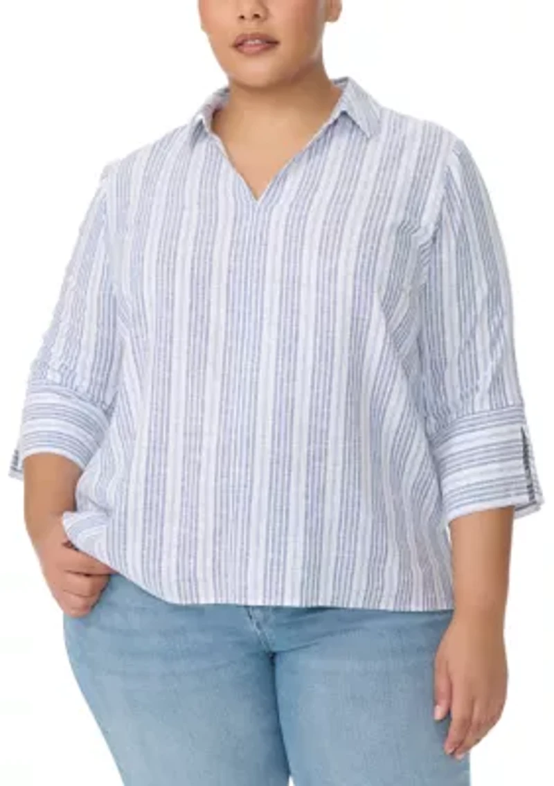 This Gloria Vanderbilt top is perfect for any occasion, featuring charming 3/4 sleeves and a sharp collar for a chic look all day long. Pullover Collar 3/4 sleeves Unlined Imported Product Specifications 25" L Material & Care 55% linen, 45% rayon Machine washable
