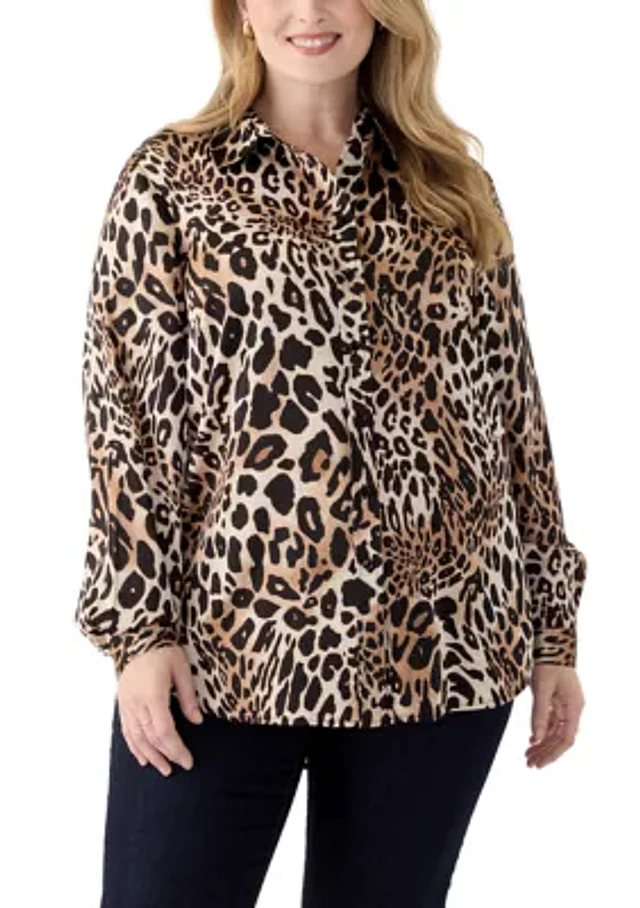 Anne Klein Plus Size Printed Long Sleeve Button Down Shirt