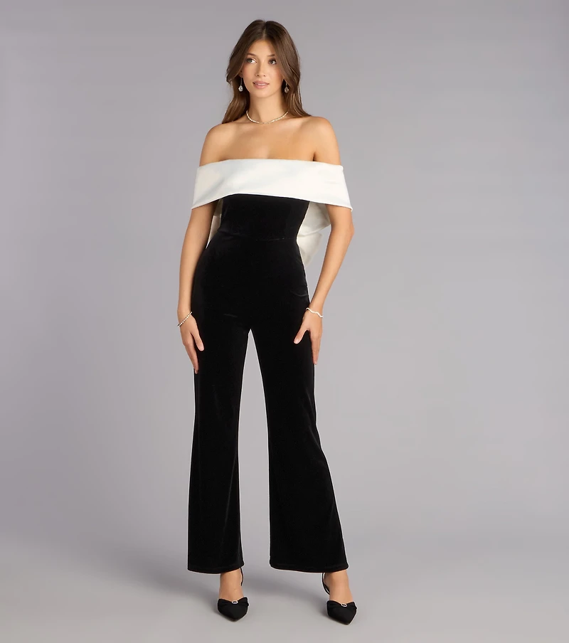 The kind of piece that walks in polished before you even say a word. This off-the-shoulder velvet jumpsuit flexes a dramatic satin bow-back design, setting a chic and luxe vibe. Fit & Features Velvet fabric with top knit lining, high stretch Satin woven off-the-shoulder neckline, large bow-back design No-slip strip Side zipper with hook-eye closure High-waist seam Hip-hugging fit, flared-leg silhouette Runs true to size