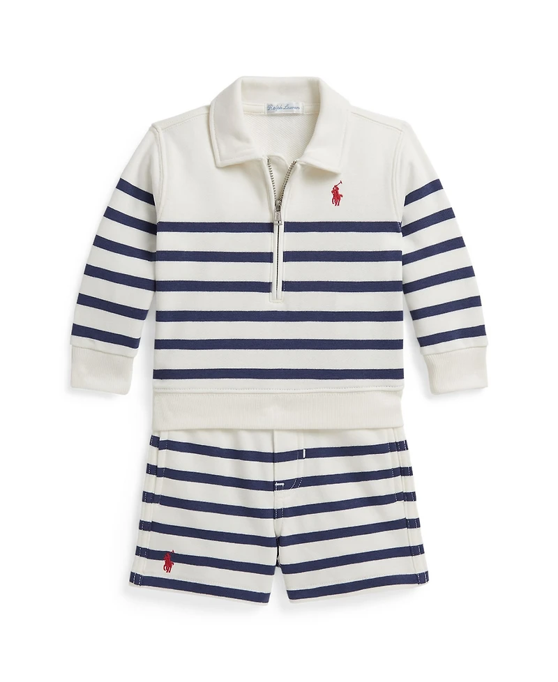 Striped cotton-blend French terry makes this Polo Ralph Lauren quarter-zip T-shirt and shorts set cozy and comfortable. Signature embroidered Pony details, ribbed trims, and a drawstring waistband combine classic style with all-day ease for little ones.