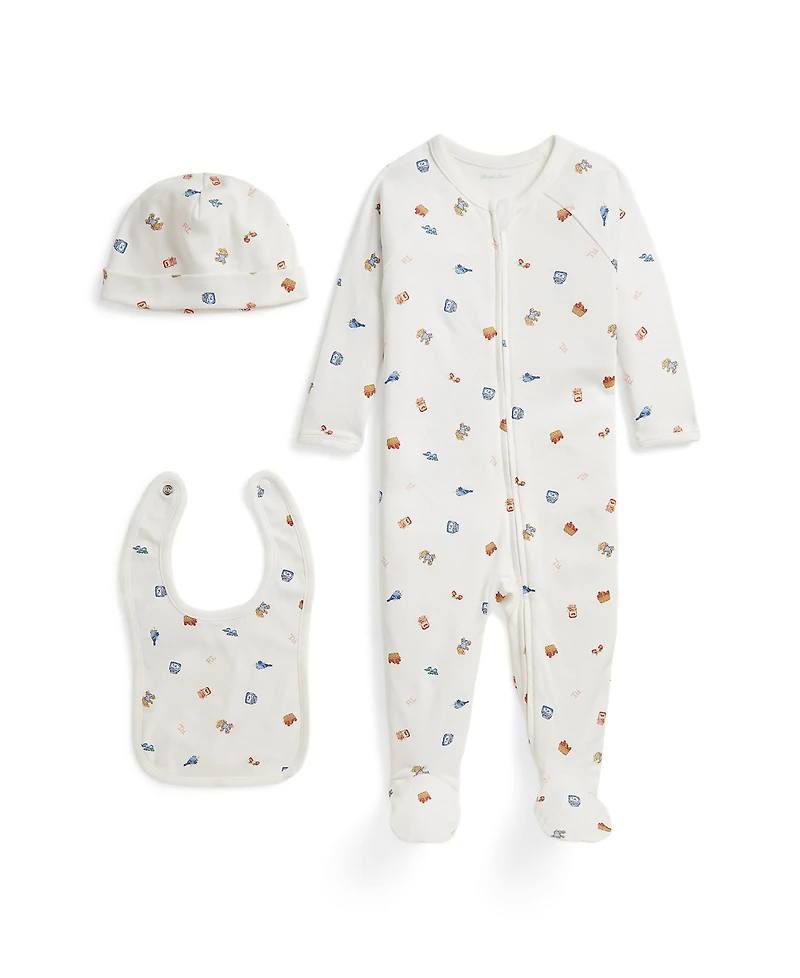 Arriving in a signature gift box, this Polo Ralph Lauren set includes a footed coverall, beanie, and bib adorned with an adorable motif. A zip placket ensures convenient dressing for little ones.