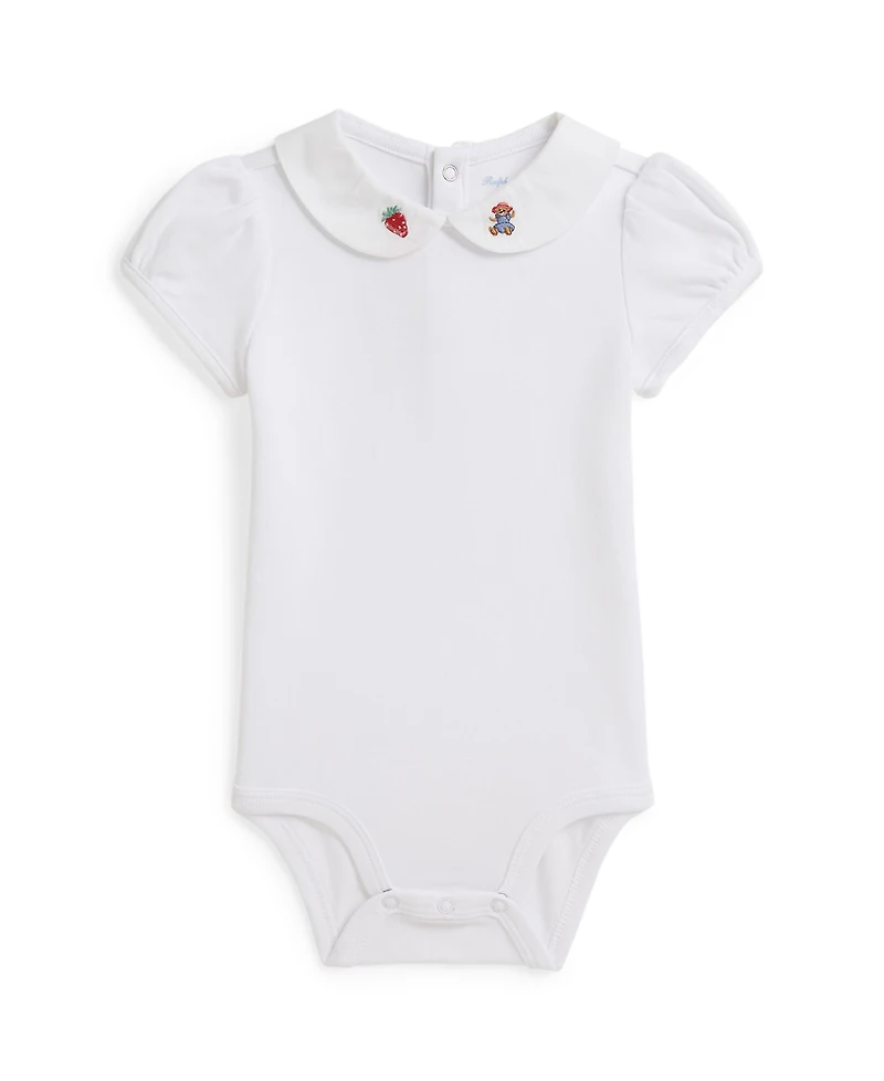 Highlighting charming embroidered details, this Polo Ralph Lauren bodysuit features a classic Peter Pan collar. Puffed short sleeves and a three-snap placket make it easy to wear.