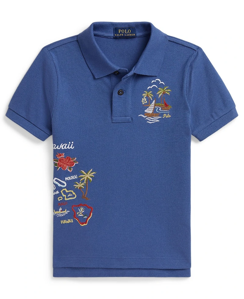 Bring island energy to the lineup with this Polo Ralph Lauren mesh polo shirt, featuring a tropical ""Polo"" graphic. A vibrant Hawaiian map motif adds distinctive character, while breathable mesh fabric and a classic collar keep the look fresh and comfortable.