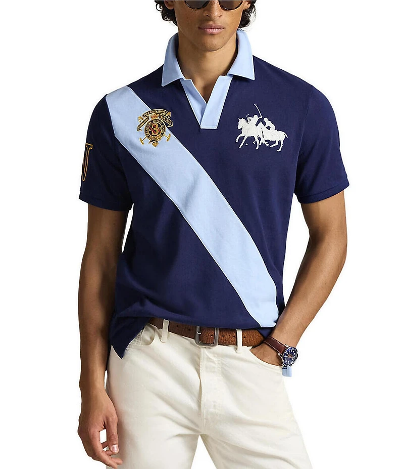 From Polo Ralph Lauren, this polo shirt features: Johnny collar Short sleeves with ribbed armbands Twill "3" patch on the right sleeve and center back "Polo Ralph Lauren Established MCMLXVII", "P.R.L. Co. Fine Quality Goods", "3", 2 crossed mallets, and a crown embroidered on the right side of chest Double "Pony" logo embroidered on the left side of chest Even vented hem Pullover construction Classic fit Cotton jersey Machine wash/tumble dry Imported.