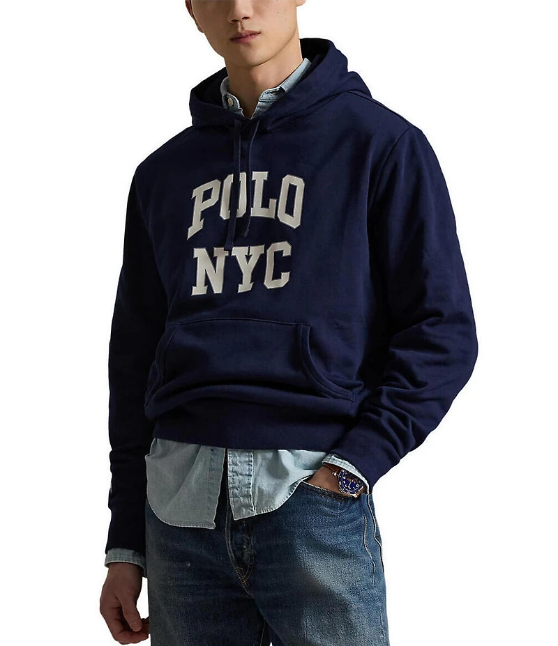 From Polo Ralph Lauren, this hoodie features: Drawstring hood with waffle-knit lining Long sleeves with ribbed cuffs Signature embroidered "Pony" above the right cuff “POLO NYC” printed on the center front Ribbed panels at each side Kangaroo pocket Ribbed hem Pullover construction Fleece fabric Cotton/polyester Machine wash/tumble dry Imported.