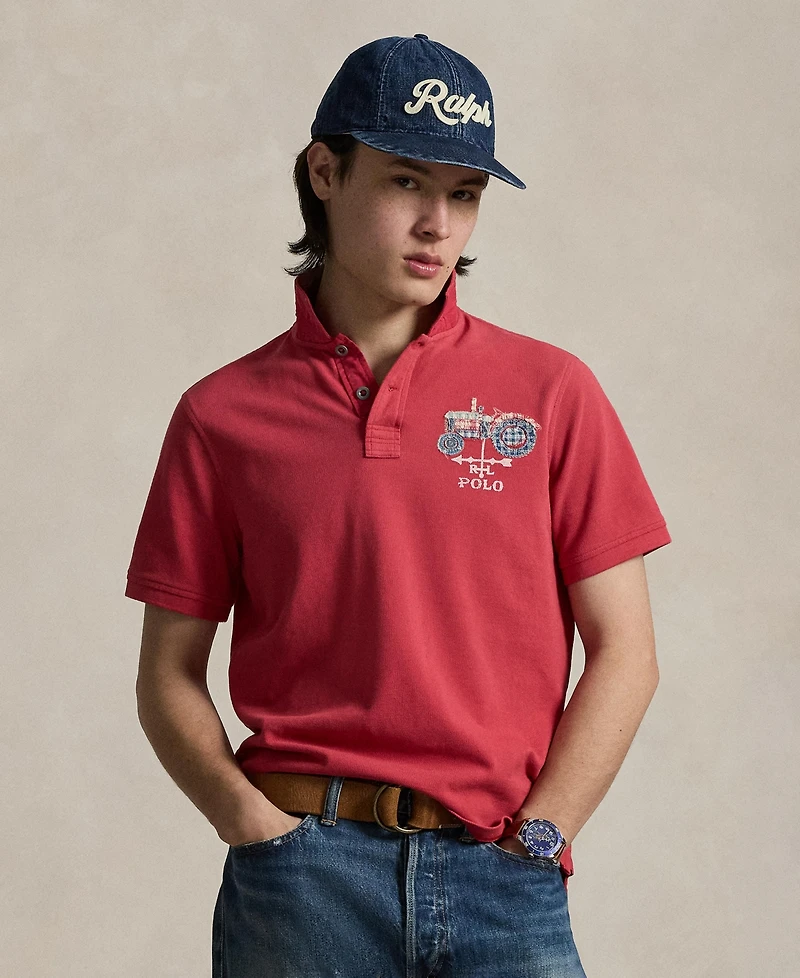 Rustic charm highlights this Polo Ralph Lauren polo shirt, designed with a distinctive patchwork tractor weather-vane applique. Traditional styling with a classic-fit keeps the look timeless while adding personality.