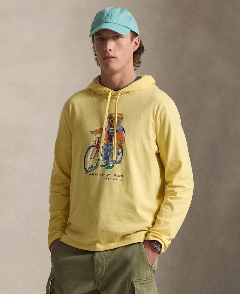 Layer up with relaxed polo style in this Polo Ralph Lauren hooded T-shirt, featuring a signature bear graphic at the center front for standout identity. A drawstring hood allows adjustable coverage while long sleeves deliver extended comfort.