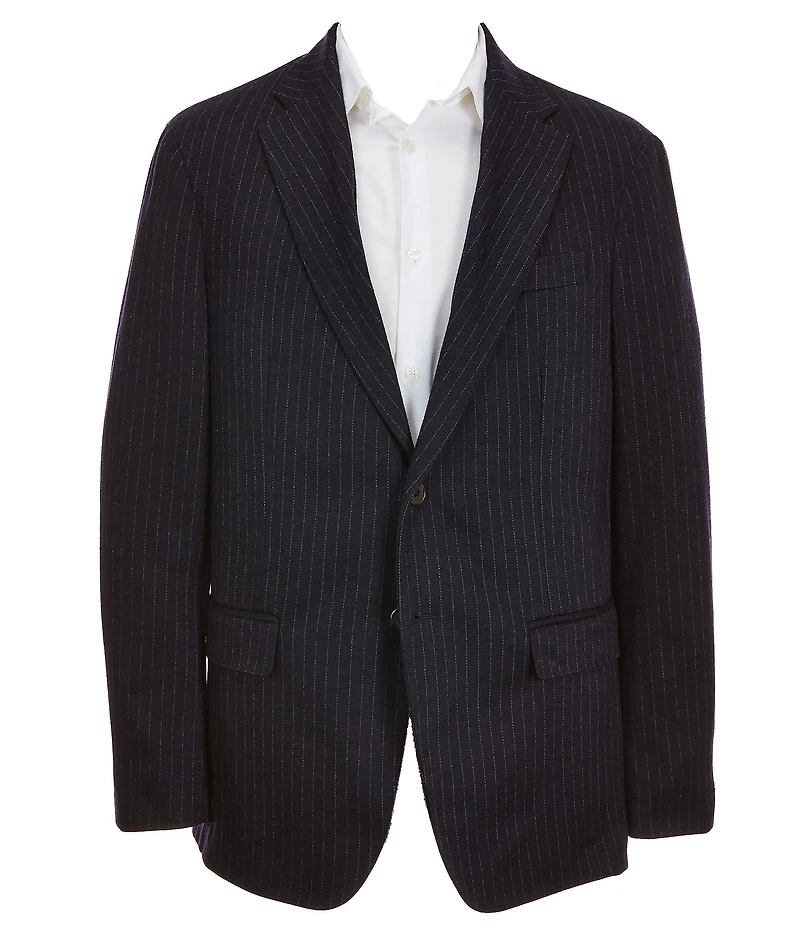 From Polo Ralph Lauren, this jacket features: Pinstriped design Modern fit Notch lapels Buttonhole at the left lapel Long sleeves Cuffs with four decorative buttons 2-button closure Left chest welt pocket 2 front waist flapped pockets 2 interior chest pockets Double vent Half-lined Shell and back yoke lining of polyester/wool/cotton; undercollar of polyester; sleeve lining of polyester/viscose Dry clean Imported.