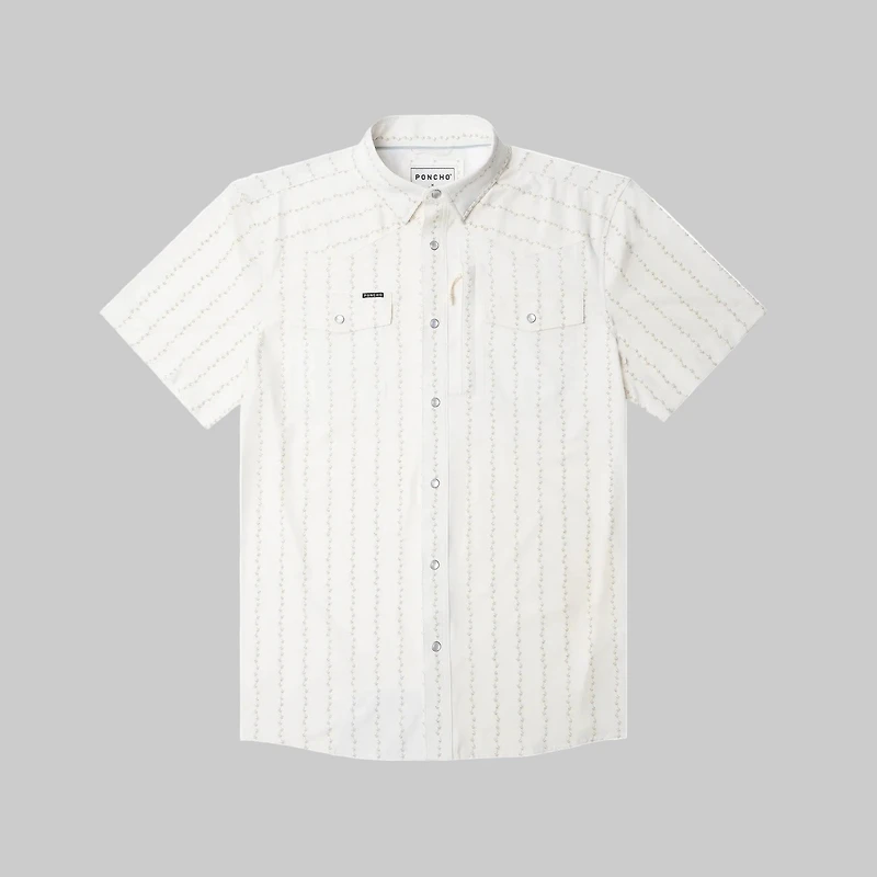 Saddle up in comfort with Poncho's classic western shirt, crafted from the same breathable, lightweight fabric that made Poncho famous. Built to keep you cool and dry from sunrise to sunset, this shirt features UPF 50+ sun protection, pearl snaps, and subtle western flair on the shoulders and pockets. Whether you're working hard or looking sharp, you'll appreciate the vented back, hidden zippered pocket, sunglasses holder, and built-in lens cloth. With quick-dry technology and stretchy fabric, you're ready for whatever the frontier throws your way.