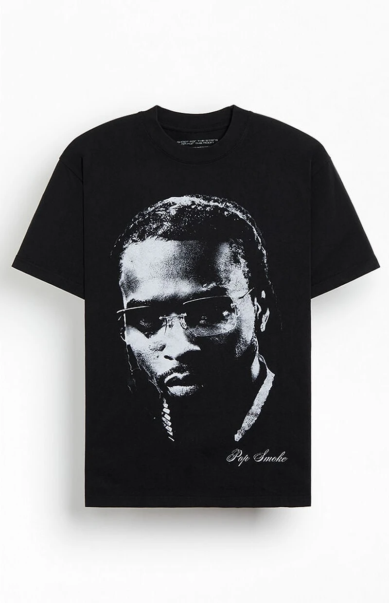 The Pop Smoke Big Head T-Shirt brings bold, streetwear-ready style with standout graphics. It features short sleeves, a crew neckline, a Pop Smoke graphic on the front, and a text graphic across the back.