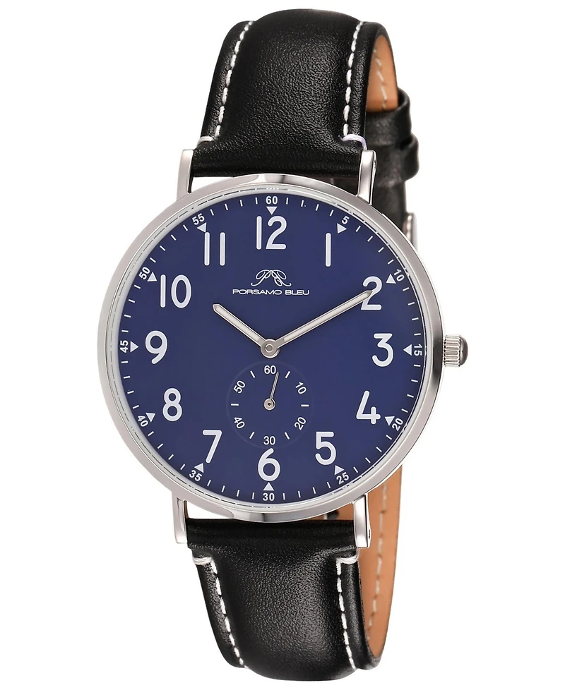 Porsamo Bleu Rowan Men's Watch With Stainless Steel Case And Black Genuine Leather Band Blue Dial Silver Tone and Black