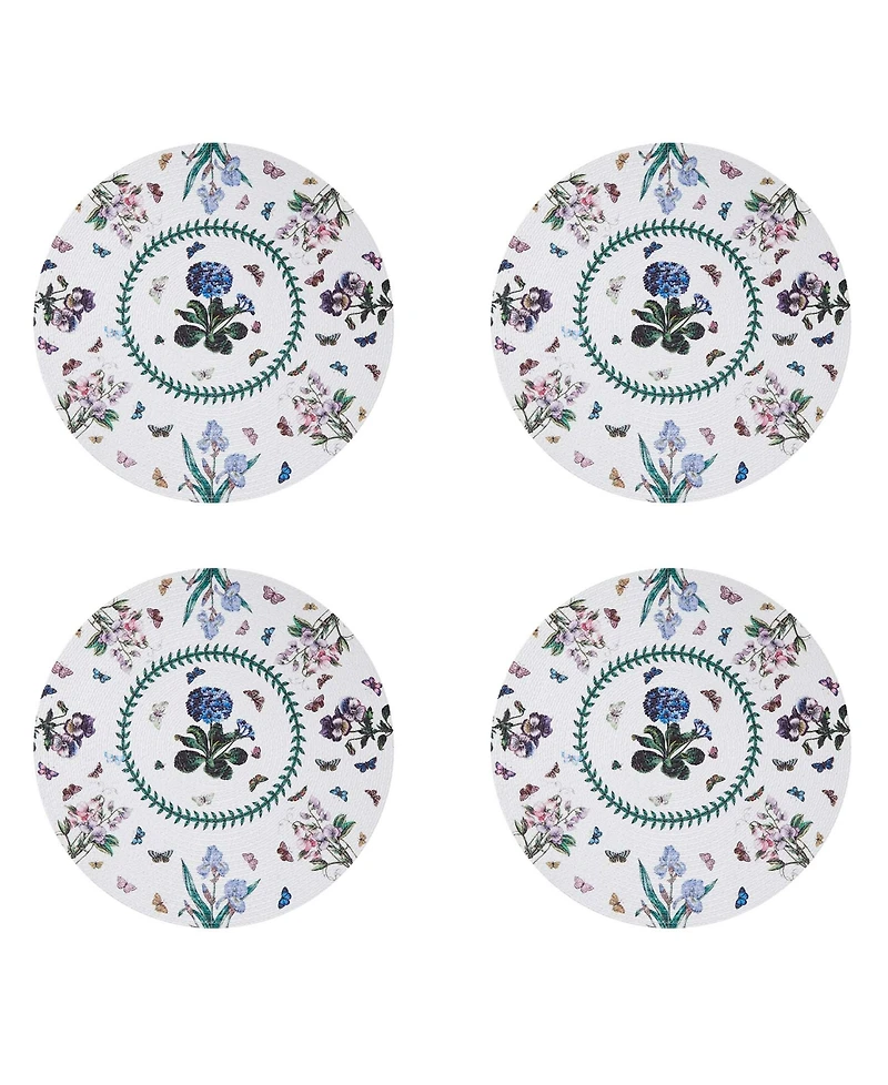 The Portmeirion botanic garden set of 4 woven braided round placemats features the classic floral design with a large purple hydrangea in the center surrounded by a wreath of colorful flowers with the signature green border in between. Printed on polyester for easy care and brilliant colors.