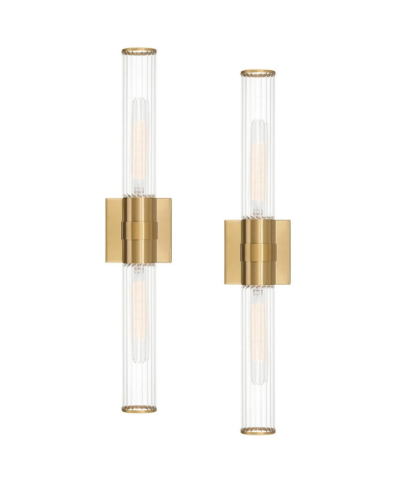 The Adeline collection of bathroom vanity lights, from the Possini Euro Design brand, is here to showcase slender, vintage inspired modern charm. This warm brass finish design boasts two clear ribbed glass shades with a matching warm brass finish metal rim, each housing one of the two tube bulbs for this bath bar. Ideal for highlighting a mirror or vanity area.