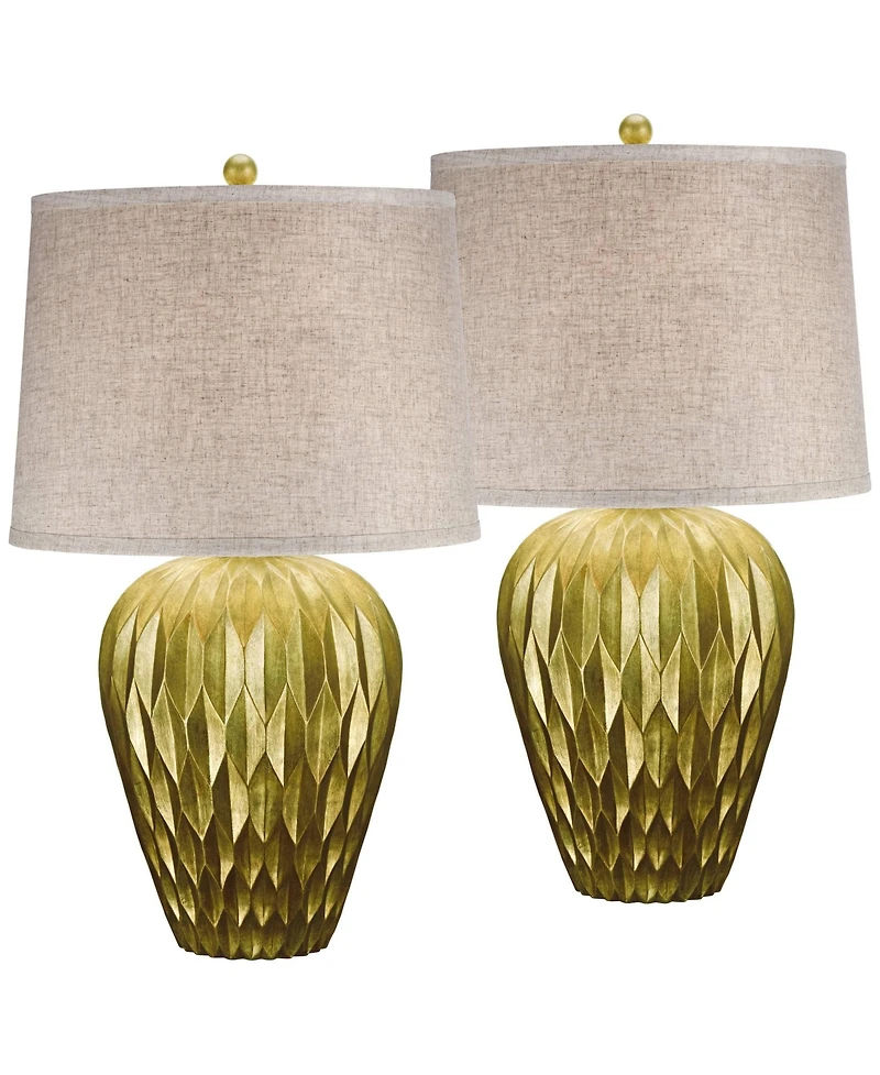 These warm bronze finish table lamps feature a modern urn shape body textured in a wonderful dimple motif that emulates folded paper. A simple drum shade and a bronze finish round finial complete this versatile look on each lamp. Able to accommodate a high-wattage bulb, the design is both stylish and functional as a reading light.