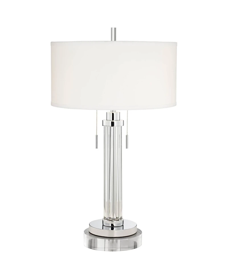 The perfect addition to modern decor, this column table lamp with 8" wide round riser features five glass columns rising from a stacked chrome base to a white crisp linen shade. With two pull chain switches that control the light output.