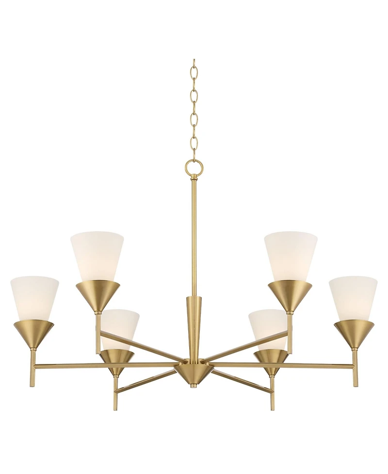 Conical details abound, lending fluid movement and understated elegance to a Mid-Century Modern six-light chandelier. Showcasing a plated gold finish, it offers intriguing warmth over your entry or dining table. From Possini Euro Design, this chandelier stands the test of time and offers soft, glowing illumination with white glass shades.