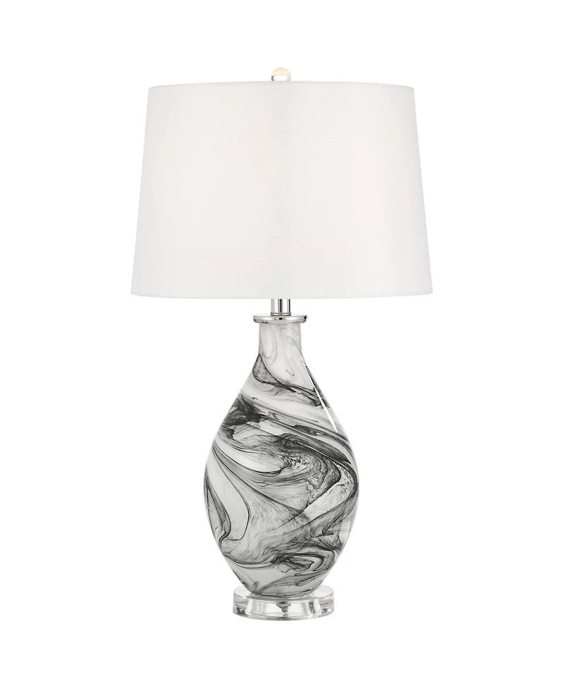 Elevate your decor with the graceful silhouette and modern elegance of the Possini Euro Marisa table lamp. Standing 27 1/2 inches high, this statement piece features a stunning art glass base with swirling patterns that create a sense of fluid motion and dimension. A clean white fabric tapered shade balances the design with a crisp, modern touch. Ideal for bedrooms, living rooms, or entryways, this lamp offers both ambient lighting and standout style.