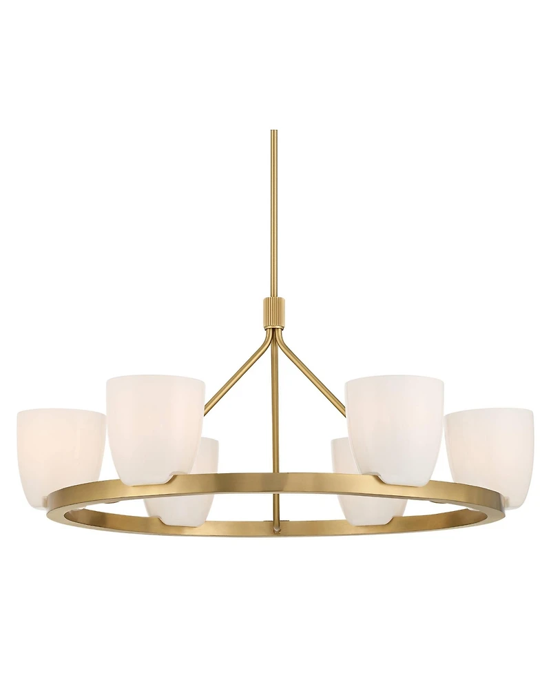 Looking for the perfect chandelier to elevate your dining or living room? The Yvette six light ring chandelier shines in brilliant antique brass finish, presented by the Possini Euro Design brand. Six candelabra bulbs are spread evenly around the ring, each housed within a white opal glass shade, diffusing warm illumination. The Yvette chandelier includes several downrods, so you can adjust the height to your preference, and is dry location rated for indoor use.