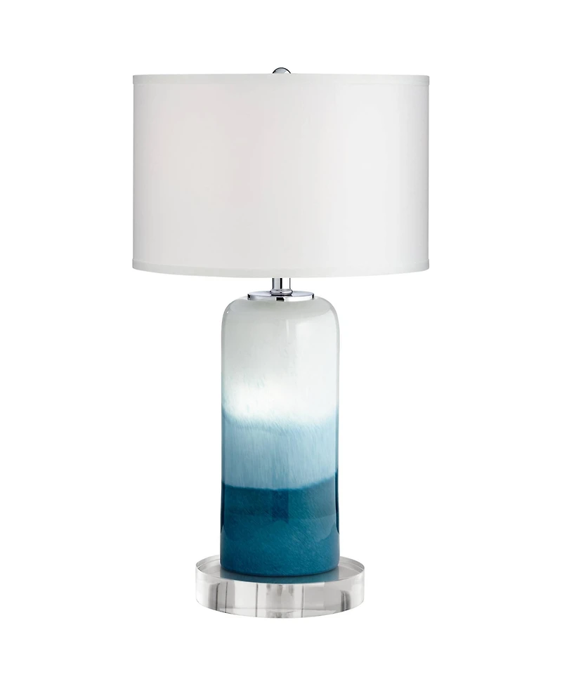 Update your living space with this contemporary coastal table lamp with 8"" wide round riser from Possini Euro Design. It comes in a hand-crafted art glass column body that starts off in white and fades into lush shades of blue in gradient rows. A clean white drum shade on top hides the four-way switch, which can be used to operate the main light and the nightlight feature. An energy-efficient Led bulb is included for use with the nightlight. Perfect for casual modern spaces.