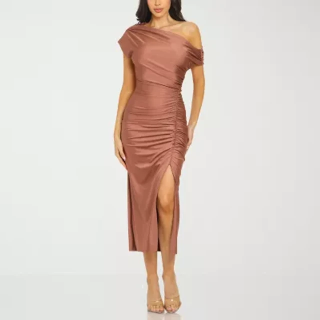 Premier Amour One Shoulder Womens Short Sleeve Midi Sheath Dress