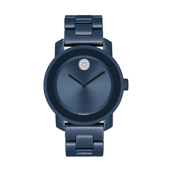 This gorgeous tonal blue watch from the movado bold evolution collection features a 36mm blue ceramic case and bracelet. The watch showcases a matching blue sunray dial and crystal pave dot.