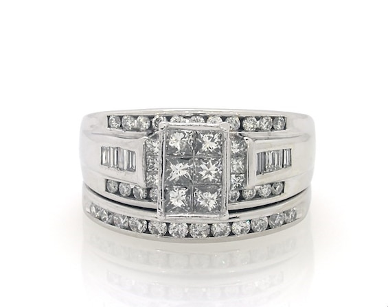 Designed to sparkle for a lifetime, this dramatic diamond bridal set is the one for her. 14k white gold six princess-cut diamonds create a stacked centerpiece channel-set princess-cut diamonds flank the center stacked baguette- and round-cut diamonds in channel settings decorate the wide band total diamond weight is 1 1/5 carats size 7. 5