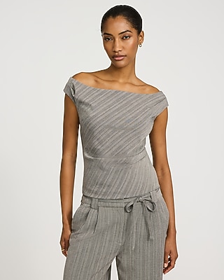A sculptural off-the-shoulder top that features a suiting striped print and a side zip closure.