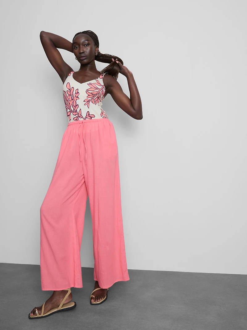 Longline tankini top with V-neckline, adjustable double straps, and a botanical-inspired print