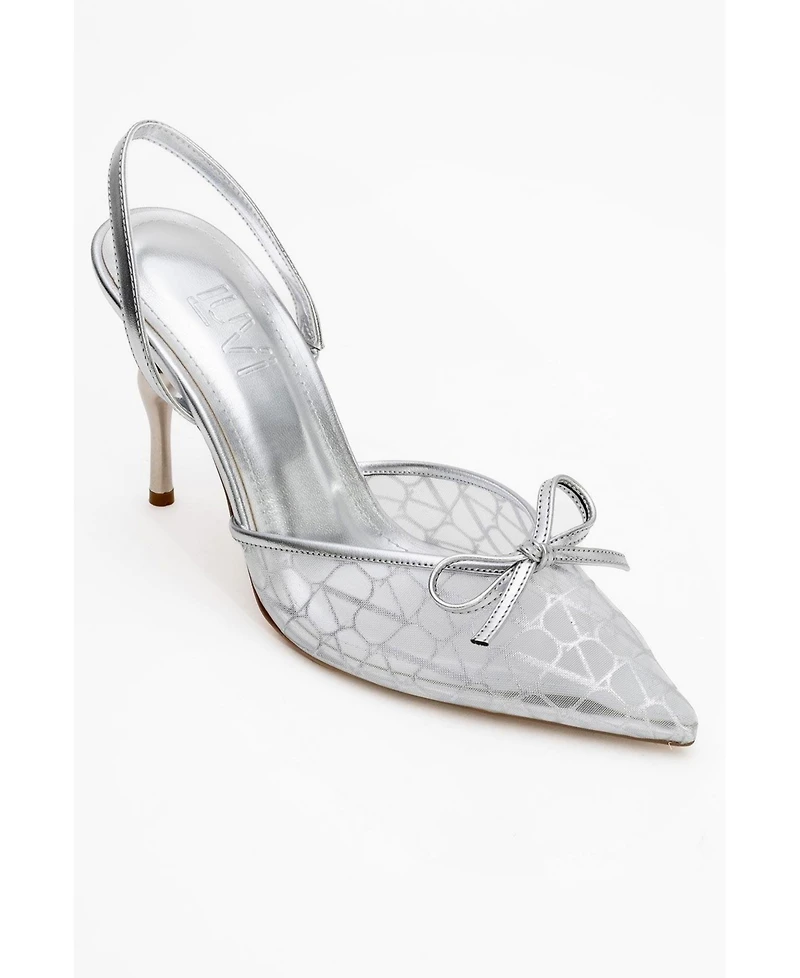 A sophisticated pump that pairs metallic details with delicate mesh and a subtle bow for elevated evening looks