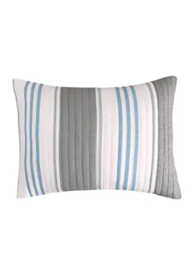 The Provincetown Quilted King Sham by Levtex Home is inspired by modern nautical influences. Offered in grey, white, and blue, this design will immediately transform your bedroom. This sham features simple, striped design in blue and grey in cotton on the front, reversing to a white anchors on a grey ground on the back. The King Sham (36x20in.) is quilted with a cotton rich filler and is machine washable. Pillow inner not included. Enjoy this for years to come! China Imported Product Specifications 20" L x 36" W Material & Care Cotton fill Cotton Machine washable, gentle cycle