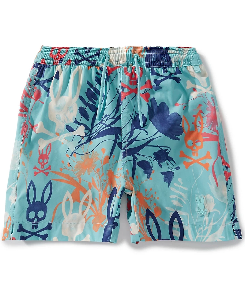From Psycho Bunny, these swim trunks feature:  Allover print Drawstring at elasticized waistband 3 pockets Mesh lining Panel print Quick-dry Polyester/polyamide/elastane  Machine wash/tumble dry  Imported.