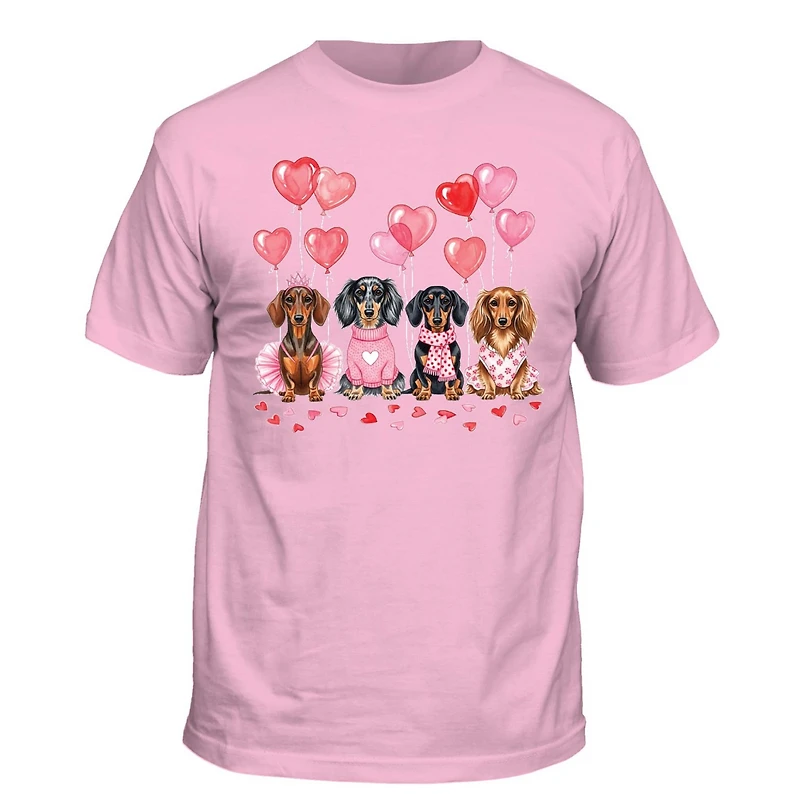 Shop the Puppy Love short sleeve t-shirt in blossom pink featuring adorable dachshund pups with heart balloons. A cute, comfy graphic tee perfect for Valentine’s season and everyday wear.