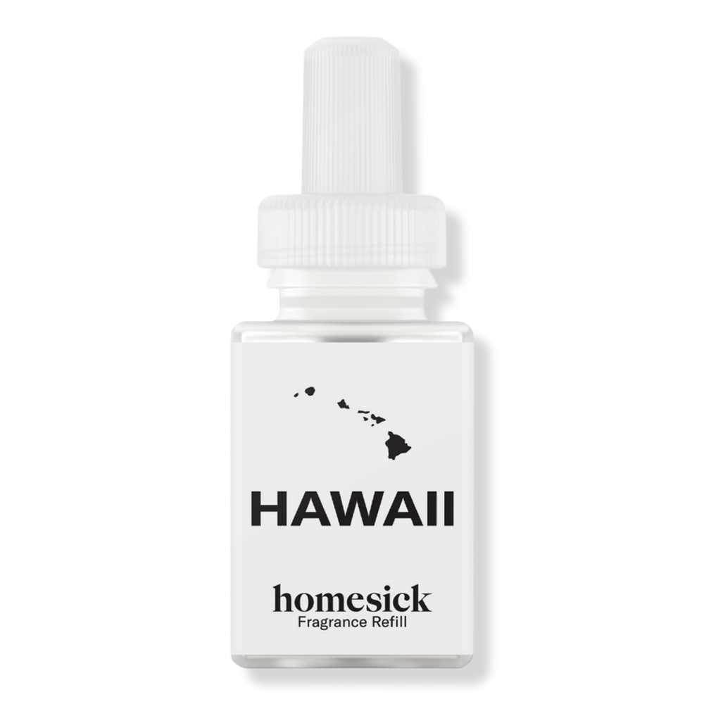 PURA X HOMESICK HAWAI DIFUSER RFL .33OZ. Features: Juicy pineapple and coconut combine with sandy shore breezes, ocean tides, cyclamen flowers, and just a hint of sugar cane. Aloha, Hawaii!. Pura avoids ingredients known to cause potential harm to health or the environment.. Every fragrance is safe and ethically sourced.. Each refill will last up to 120 hours on medium intensity.. Pura fragrances are thoughtfully designed to never include harsh chemicals.. Automatic vial detection - Simply insert your smart fragrance vial and Pura 4 automatically detects the fragrance, creating a seamless swapping experience.. Fragrance Family: Floral. Fruity. Say aloha to the beautiful Hawaiian islands with notes of pineapple and coconut, seashore and sugar, and cyclamen flowers circling a vanilla base.. Key Notes: Top - pineapple, coconut. Middle - seashore, cyclamen. Base - sugar, vanilla, musk.