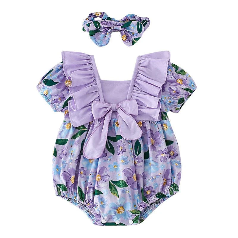 Introduce your little one to effortless elegance with this charming purple floral bow baby romper. Featuring a delicate floral print and coordinating bow detail, this one-piece outfit delivers style without the fuss—perfect for photos, special occasions, or everyday wear. The included matching headband adds an extra touch of sweetness, making coordinating outfits simple. Crafted for comfort and designed to impress, this romper is a wardrobe essential that parents love and babies adore.