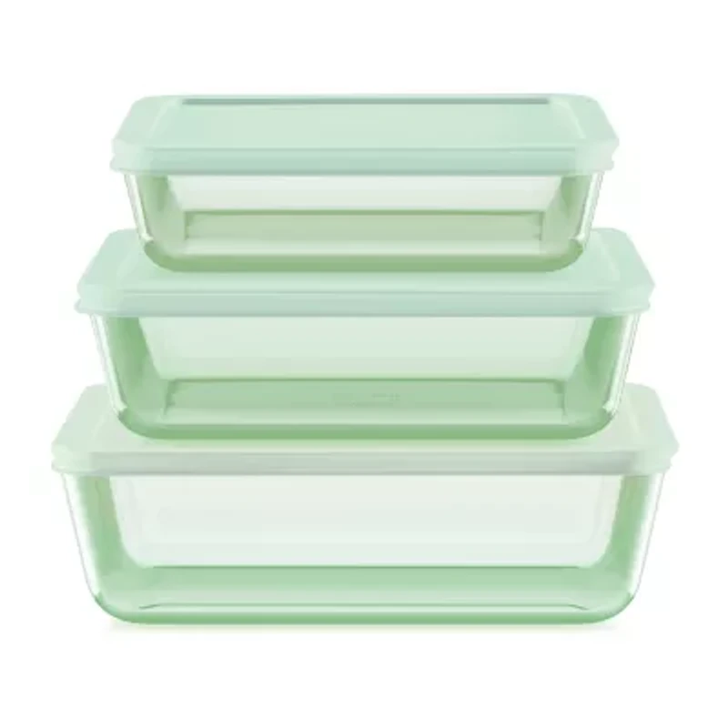 The storage we love with the fresh style we crave! We've added a pop of color to our classic glass dishes to help every day feel elevated with serve-worthy appeal. The three sizes in this green-tinted set are perfect for everything from leftovers and snacks to meal prep and packing to go. Add the coordinating bpa-free lids to keep food fresh and warm until next time. When work is done, just nest and stack these dishes together to save space or look beautiful on display. The tempered Pyrex® glass resists stains and doesn't absorb odors and flavors. It's also oven, microwave and dishwasher safe. Storage made simply stunning!